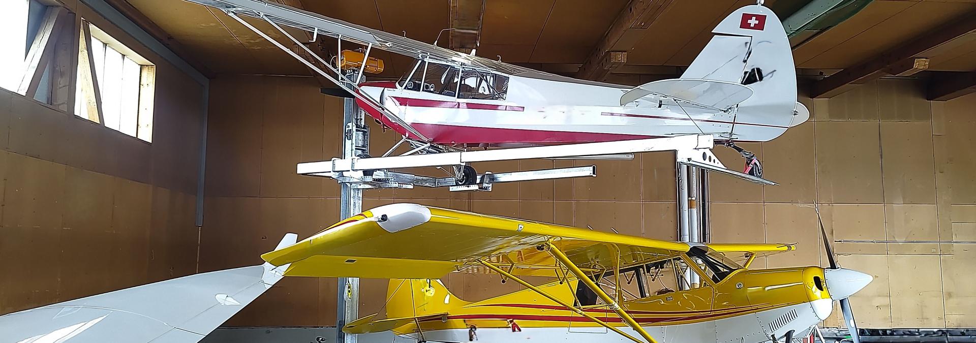Einen Flugzeugplatz zu wenig in Ihrem Hangar? Die ideale Lösung um einen bereits bestehenden Hangar effizienter zu nutzen. Der Flugzeuglift wird individuell nach Mass angefertigt.